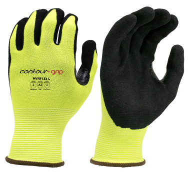 13 gauge Hivis green nylon/spandex liner, sandy nitrile coated, Cut level A3, touch screen compatible